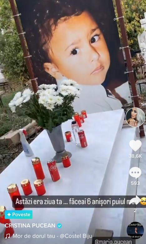 Cristina Pucean a postat un videoclip în care a filmat mormântul micuțului și a scris „Astăzi era ziua ta … făceai 6 anișori puiul meu”. Blondina este sfâșiată de durere și a ținut să împărtășească acest lucru cu fanii ei, că nu este o zi oarecare, ci un moment greu și dureros pentru întreaga ei familie.