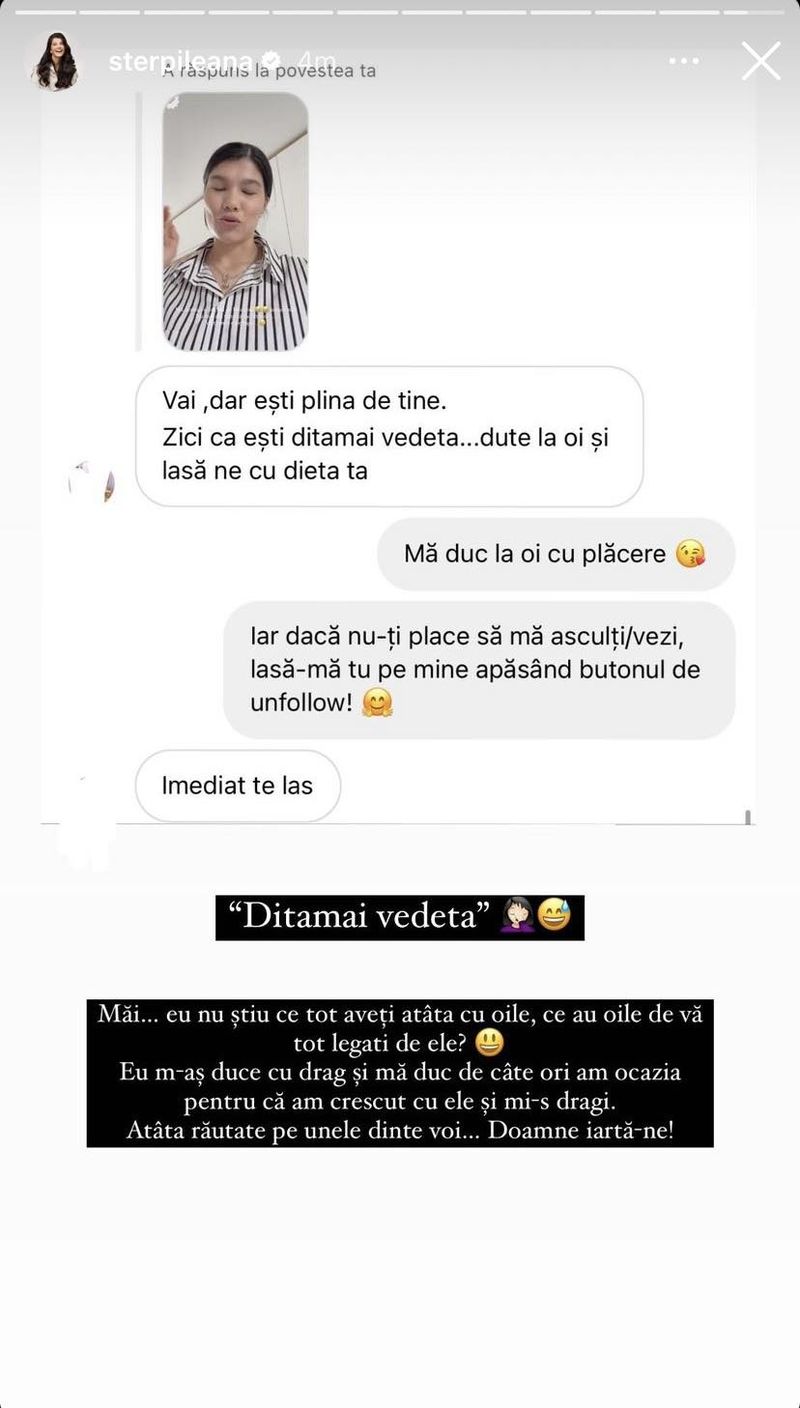 „Ditamai vedeta” Măi… eu nu știu ce tot aveți atâta cu oile, ce au oile de vă tot legați de ele? Eu m-aș duce cu drag și mă duc de câte ori am ocazia pentru că am crescut cu ele și mi-s dragi. Atâta răutate pe unele dintre voi… Doamne iartă-ne!”, a scris Ileana Sterp în postarea de pe Instagram.