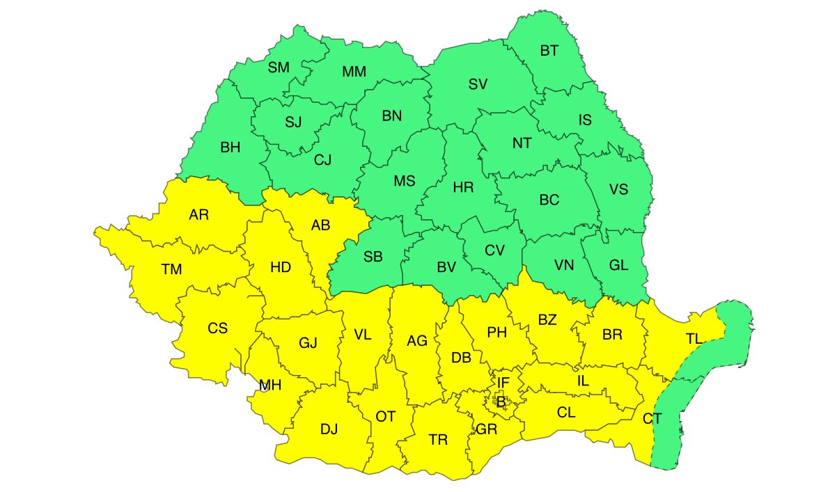 De asemenea, meteorologii au mai emis și un al doilea cod, valabil joi, între 12 și 21.00. Sunt vizate Capitala și alte 22 de județe din Banat, Oltenia, Muntenia, sudul Crișanei, sud-vestul Transilvaniei și Dobrogea continentală.
