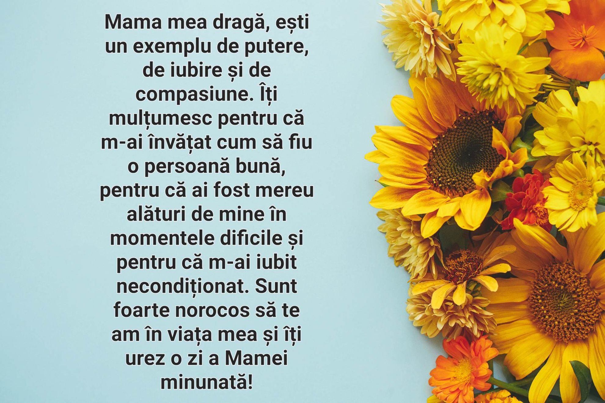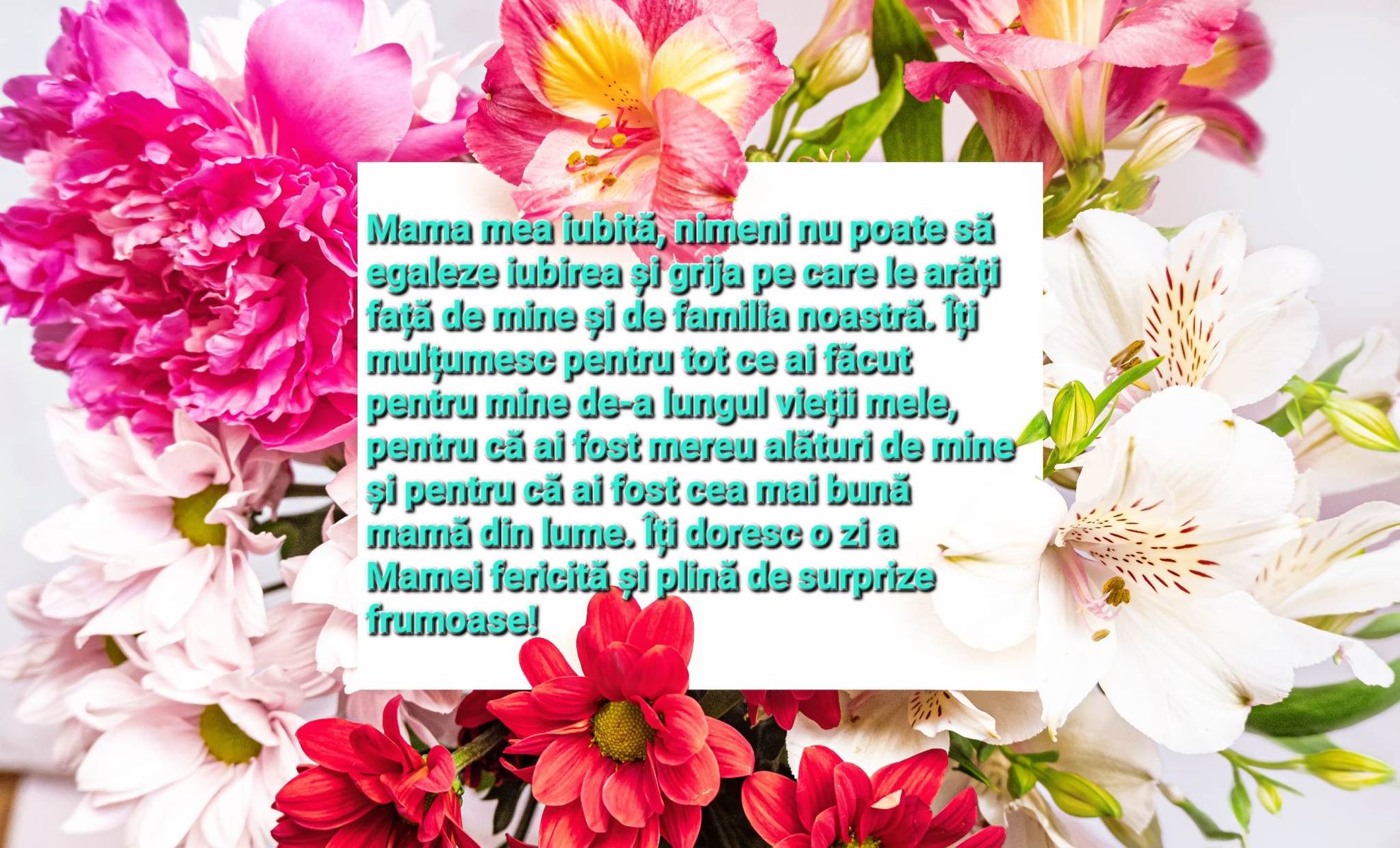 Pentru cea mai frumoasă și iubitoare mamă din lume, îți doresc o zi specială, așa cum meriți tu. Mulțumesc pentru toate sacrificiile pe care le-ai făcut pentru mine și pentru iubirea și înțelegerea pe care mi le-ai arătat întotdeauna.