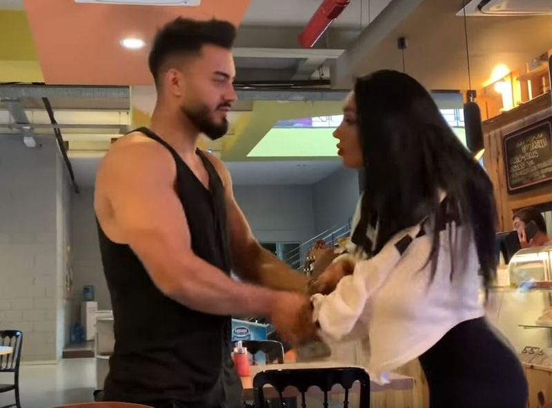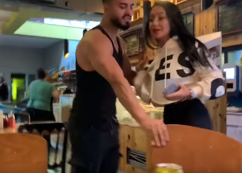Jador, simțind că nu e ok să se poarte așa cu femeia cu care împărtășește clipe pasionale, mai mult sau mai puțin oficial, s-a ridicat de la masă și, cu forța, o aduce din nou lângă el, dopar că discuțiile continuă pe un ton cât se poate de violent. ”Stai aici, stai singură acolo, ești proastă?”, spune Jador în timp ce aproape o târăște pe Ella de la ”Puterea Dragostei” spre masa lui, iar bruneta, nervoasă nevoie-mare, deși e încântată de atenția manelistului, rămâne fermă pe poziție și merge înapoi la masa ei.