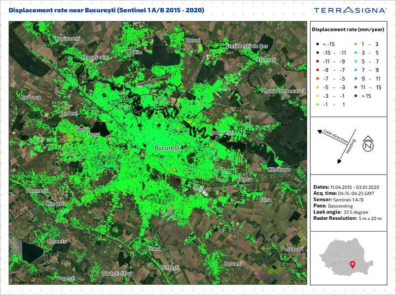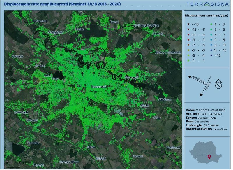 „Din cauza poziției sale pe râul Dâmbovița și a nivelurilor ridicate ale apelor subterane, riscul de tasare a terenului în Capitală este ridicat. În plus, apropierea sa de zona seismică Vrancea sporește riscul unor deformări cauzate de cutremure”, a declarat Florin Șerban, directorul general al companiei Terrasigna, care a relaizat harta, citat de Descoperă.